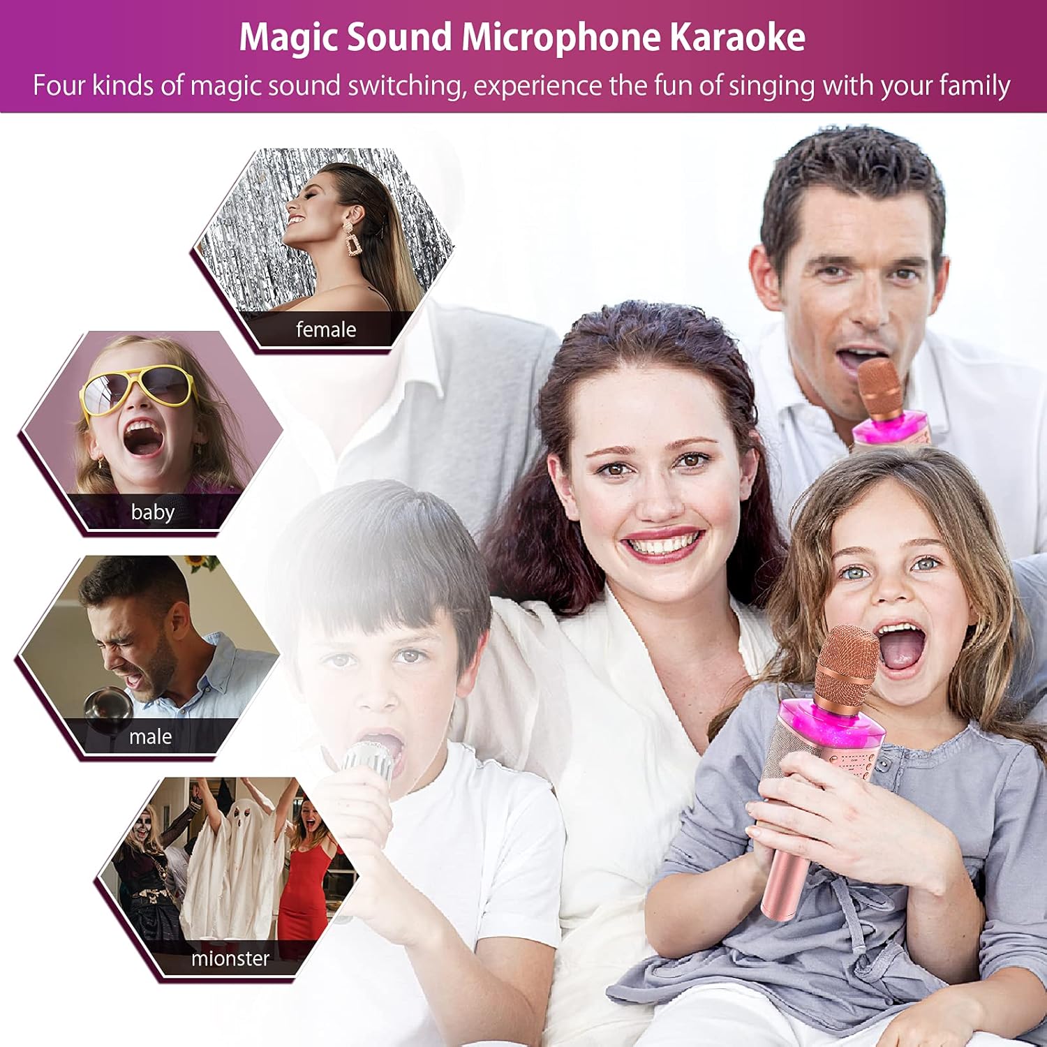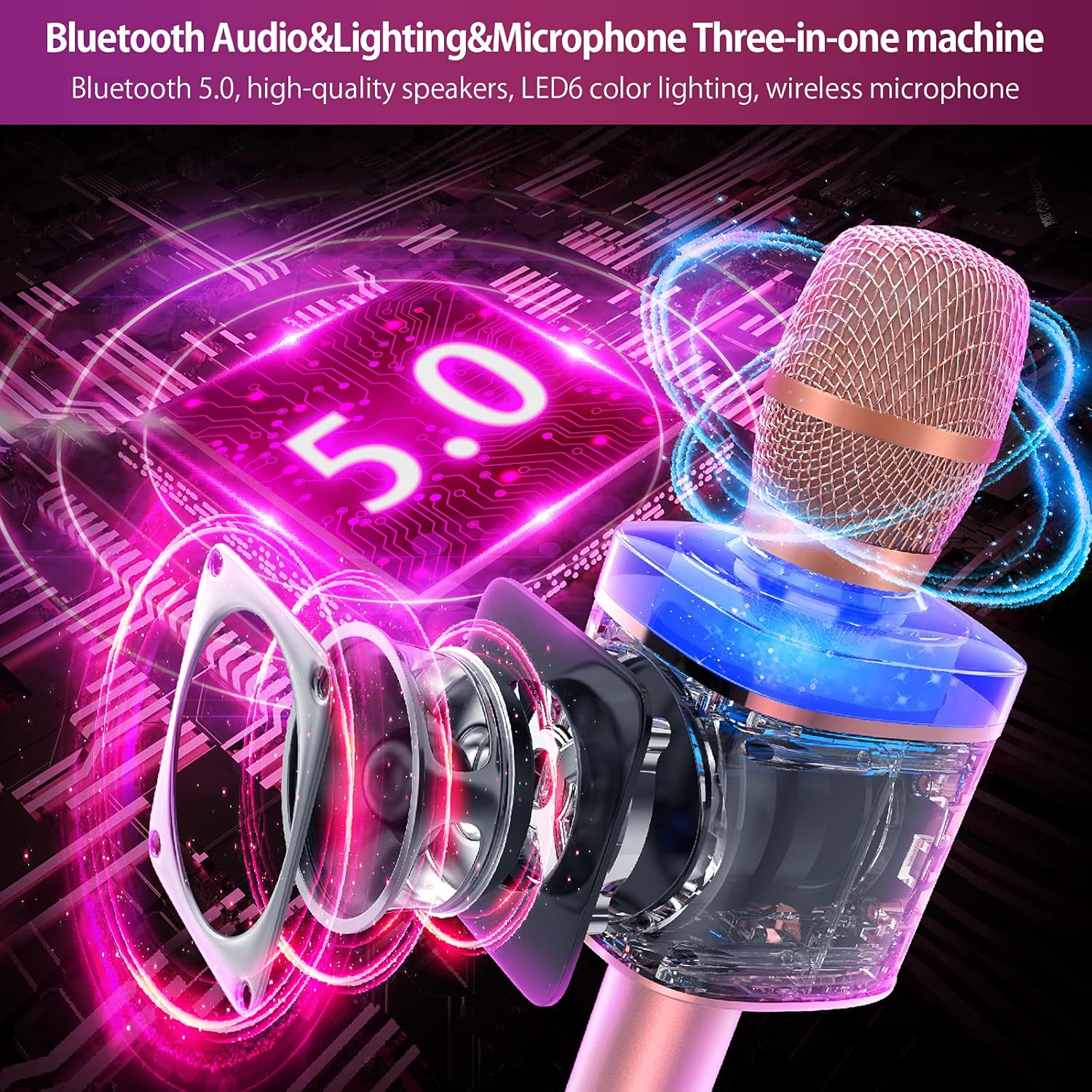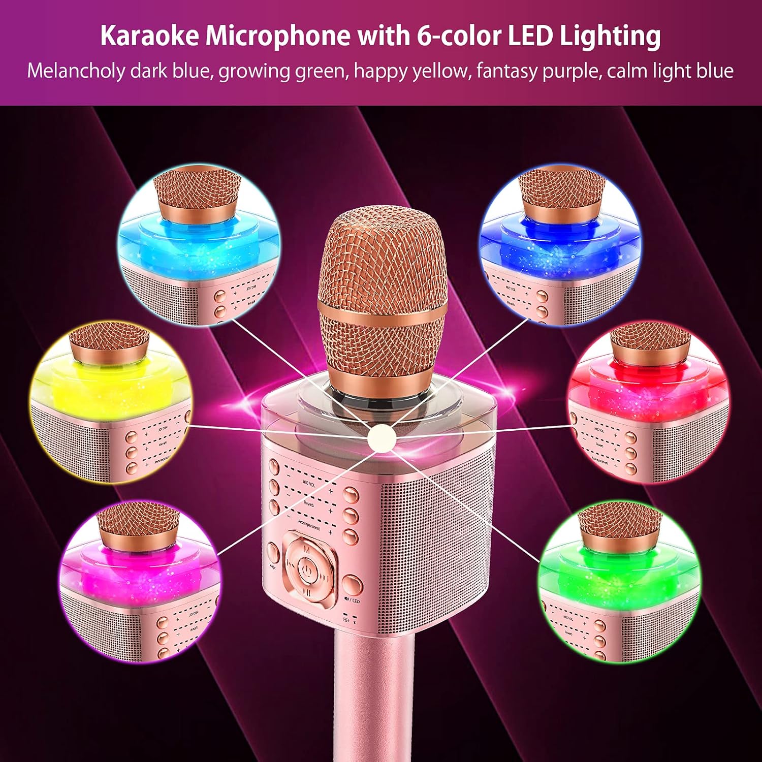Introducing the ultimate Karaoke Microphone for kids and adults! This Handheld Wireless Bluetooth Microphone is the perfect accessory for all your singing needs. With built-in stereo speakers, reverb effects, accompaniment options, mute function, recording capabilities, LED lights, and variable sound settings, this microphone has everything you need to elevate your karaoke experience.