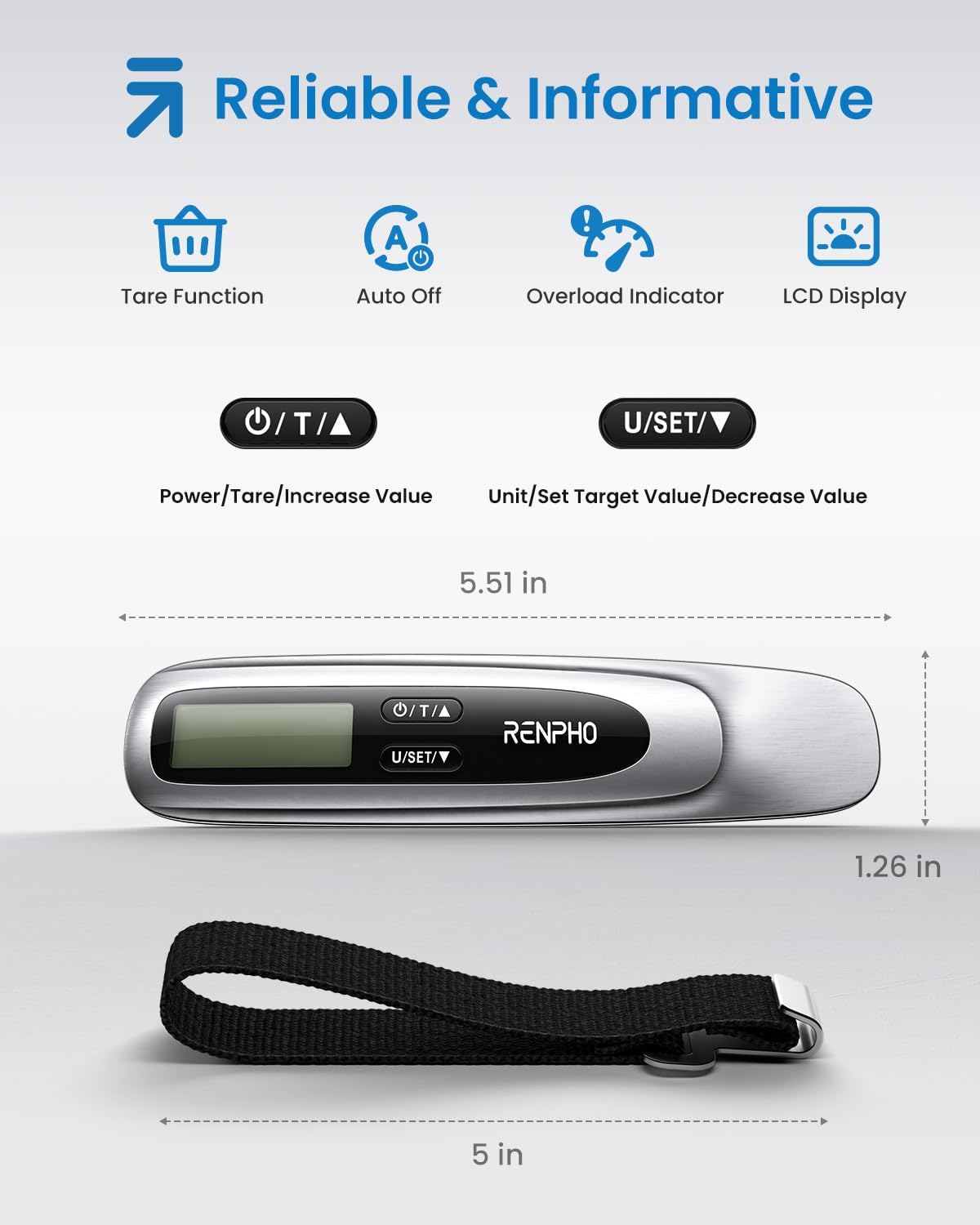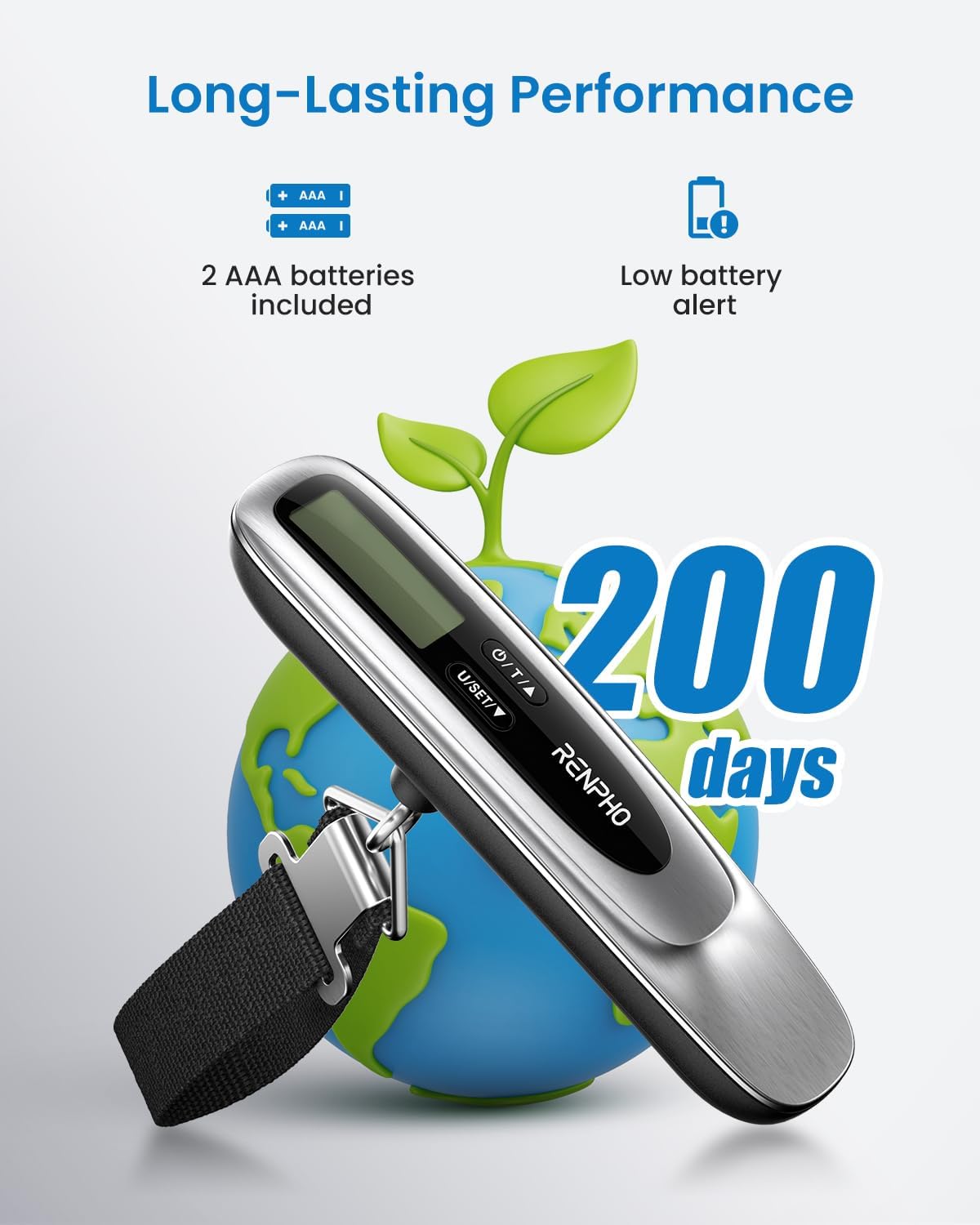 Made with durable rubber paint, this luggage scale is built to last through countless trips. The included battery ensures that you can use it right out of the box. Say goodbye to surprises at the airport and travel with confidence with the RENPHO Luggage Scale.